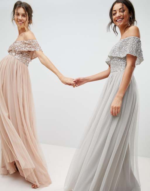 Product Name: Maya bardot sequin top tulle detail dress with high low hem 2025